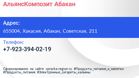 АльянсКомпозит Абакан по адресу 655004, Хакасия, Абакан, Советская, 211 в дальнейшем Организация, размещена в следующих категориях: