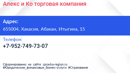 Алекс и Ко, торговая компания по адресу 655004, Хакасия, Абакан, Итыгина, 15 в дальнейшем Организация, размещена в следующих категориях: