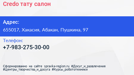 Credo, тату-салон по адресу 655017, Хакасия, Абакан, Пушкина, 97 в дальнейшем Организация, размещена в следующих категориях: