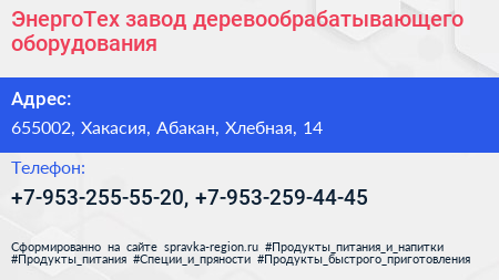 ЭнергоТех, завод деревообрабатывающего оборудования по адресу 655002, Хакасия, Абакан, Хлебная, 14 в дальнейшем Организация, размещена в следующих категориях: