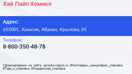 Хай Пайп Хемикл по адресу 655001, Хакасия, Абакан, Крылова, 65 в дальнейшем Организация, размещена в следующих категориях: