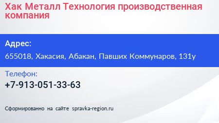 Хак Металл Технология, производственная компания по адресу 655018, Хакасия, Абакан, Павших Коммунаров, 131у в дальнейшем Организация, размещена в следующих категориях: