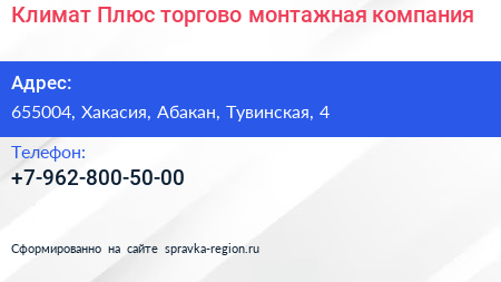 Климат-Плюс, торгово-монтажная компания по адресу 655004, Хакасия, Абакан, Тувинская, 4 в дальнейшем Организация, размещена в следующих категориях: