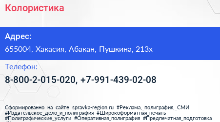 Колористика по адресу 655004, Хакасия, Абакан, Пушкина, 213х в дальнейшем Организация, размещена в следующих категориях: