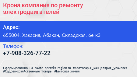Крона, компания по ремонту электродвигателей по адресу 655004, Хакасия, Абакан, Складская, 6е к3 в дальнейшем Организация, размещена в следующих категориях: