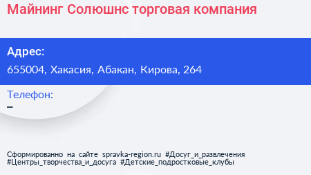 Майнинг Солюшнс, торговая компания по адресу 655004, Хакасия, Абакан, Кирова, 264 в дальнейшем Организация, размещена в следующих категориях: