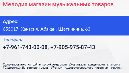 Мелодия, магазин музыкальных товаров по адресу 655017, Хакасия, Абакан, Щетинкина, 63 в дальнейшем Организация, размещена в следующих категориях:
