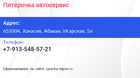 Пятерочка, автосервис по адресу 655004, Хакасия, Абакан, Игарская, 5л в дальнейшем Организация, размещена в следующих категориях: