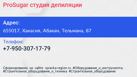 ProSugar, студия депиляции по адресу 655017, Хакасия, Абакан, Тельмана, 87 в дальнейшем Организация, размещена в следующих категориях: