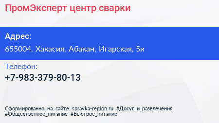 ПромЭксперт, центр сварки по адресу 655004, Хакасия, Абакан, Игарская, 5и в дальнейшем Организация, размещена в следующих категориях: