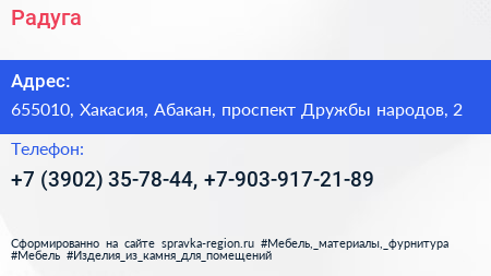 Радуга по адресу 655010, Хакасия, Абакан, проспект Дружбы народов, 2 в дальнейшем Организация, размещена в следующих категориях: