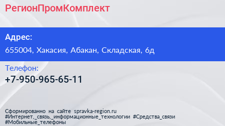 РегионПромКомплект по адресу 655004, Хакасия, Абакан, Складская, 6д в дальнейшем Организация, размещена в следующих категориях: