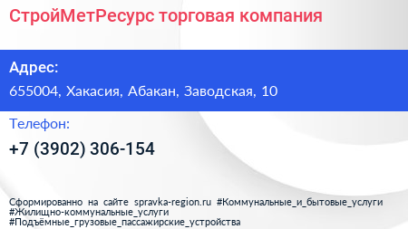 СтройМетРесурс, торговая компания по адресу 655004, Хакасия, Абакан, Заводская, 10 в дальнейшем Организация, размещена в следующих категориях: