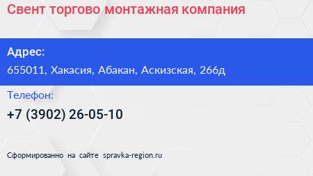 Свент, торгово-монтажная компания по адресу 655011, Хакасия, Абакан, Аскизская, 266д в дальнейшем Организация, размещена в следующих категориях: