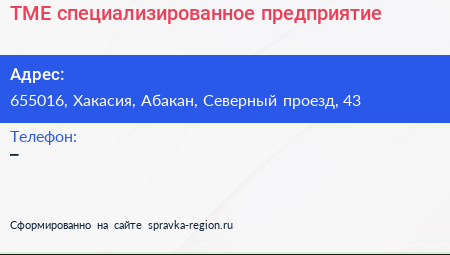 ТМЕ, специализированное предприятие по адресу 655016, Хакасия, Абакан, Северный проезд, 43 в дальнейшем Организация, размещена в следующих категориях:
