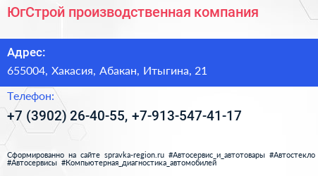ЮгСтрой, производственная компания по адресу 655004, Хакасия, Абакан, Итыгина, 21 в дальнейшем Организация, размещена в следующих категориях: