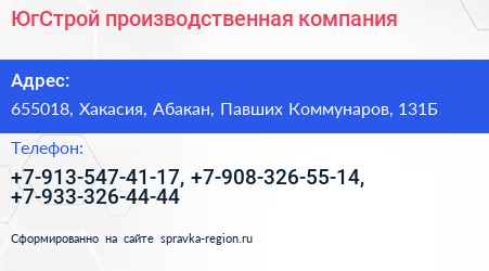 ЮгСтрой, производственная компания по адресу 655018, Хакасия, Абакан, Павших Коммунаров, 131Б в дальнейшем Организация, размещена в следующих категориях: