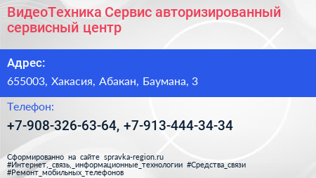 ВидеоТехника-Сервис, авторизированный сервисный центр по адресу 655003, Хакасия, Абакан, Баумана, 3 в дальнейшем Организация, размещена в следующих категориях: