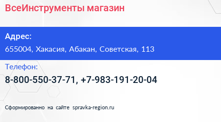ВсеИнструменты, магазин по адресу 655004, Хакасия, Абакан, Советская, 113 в дальнейшем Организация, размещена в следующих категориях: