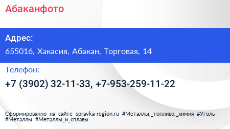 Абаканфото по адресу 655016, Хакасия, Абакан, Торговая, 14 в дальнейшем Организация, размещена в следующих категориях: