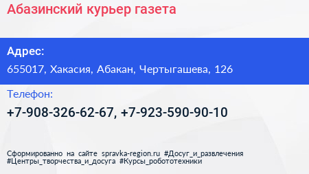 Абазинский курьер, газета по адресу 655017, Хакасия, Абакан, Чертыгашева, 126 в дальнейшем Организация, размещена в следующих категориях: