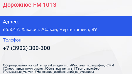 Дорожное, FM 101.3 по адресу 655017, Хакасия, Абакан, Чертыгашева, 89 в дальнейшем Организация, размещена в следующих категориях: