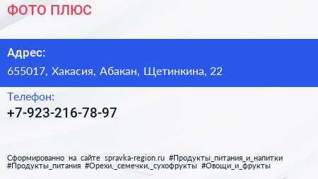 ФОТО ПЛЮС по адресу 655017, Хакасия, Абакан, Щетинкина, 22 в дальнейшем Организация, размещена в следующих категориях: