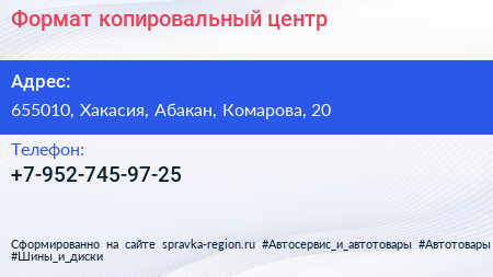 Формат, копировальный центр по адресу 655010, Хакасия, Абакан, Комарова, 20 в дальнейшем Организация, размещена в следующих категориях: