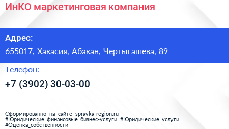 ИнКО, маркетинговая компания по адресу 655017, Хакасия, Абакан, Чертыгашева, 89 в дальнейшем Организация, размещена в следующих категориях: