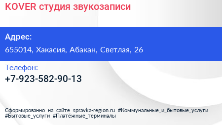 KOVER, студия звукозаписи по адресу 655014, Хакасия, Абакан, Светлая, 26 в дальнейшем Организация, размещена в следующих категориях: