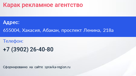 Карак, рекламное агентство по адресу 655004, Хакасия, Абакан, проспект Ленина, 218а в дальнейшем Организация, размещена в следующих категориях: