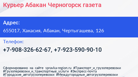 Курьер Абакан-Черногорск, газета по адресу 655017, Хакасия, Абакан, Чертыгашева, 126 в дальнейшем Организация, размещена в следующих категориях: