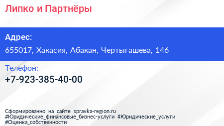 Липко и Партнёры по адресу 655017, Хакасия, Абакан, Чертыгашева, 146 в дальнейшем Организация, размещена в следующих категориях: