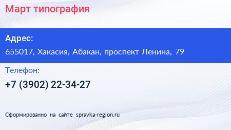 Март, типография по адресу 655017, Хакасия, Абакан, проспект Ленина, 79 в дальнейшем Организация, размещена в следующих категориях: