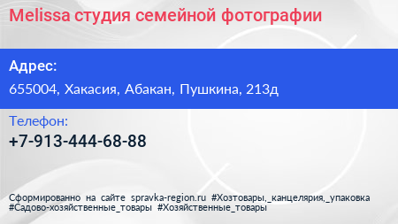 Melissa, студия семейной фотографии по адресу 655004, Хакасия, Абакан, Пушкина, 213д в дальнейшем Организация, размещена в следующих категориях: