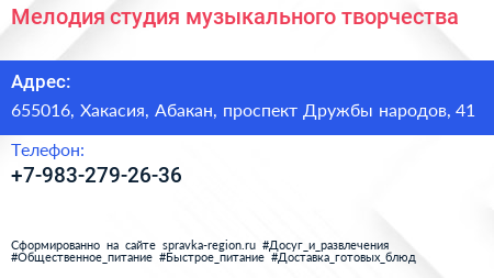 Мелодия, студия музыкального творчества по адресу 655016, Хакасия, Абакан, проспект Дружбы народов, 41 в дальнейшем Организация, размещена в следующих категориях: