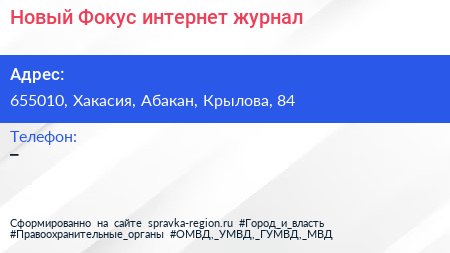 Новый Фокус, интернет-журнал по адресу 655010, Хакасия, Абакан, Крылова, 84 в дальнейшем Организация, размещена в следующих категориях: