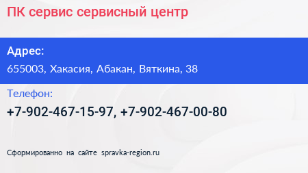 ПК-сервис, сервисный центр по адресу 655003, Хакасия, Абакан, Вяткина, 38 в дальнейшем Организация, размещена в следующих категориях: