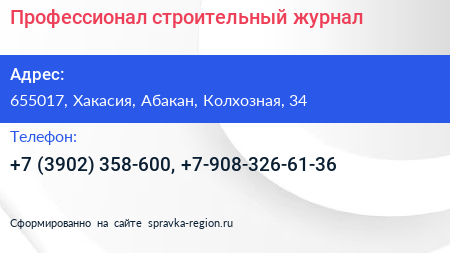 Профессионал, строительный журнал по адресу 655017, Хакасия, Абакан, Колхозная, 34 в дальнейшем Организация, размещена в следующих категориях: