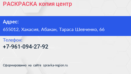 РАСКРАСКА, копия-центр по адресу 655012, Хакасия, Абакан, Тараса Шевченко, 66 в дальнейшем Организация, размещена в следующих категориях: