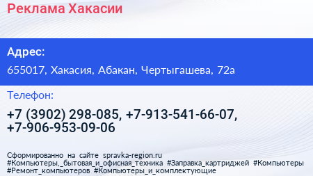 Реклама Хакасии по адресу 655017, Хакасия, Абакан, Чертыгашева, 72а в дальнейшем Организация, размещена в следующих категориях: