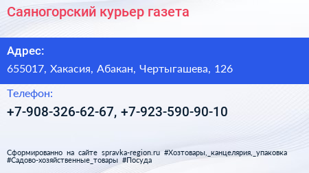 Саяногорский курьер, газета по адресу 655017, Хакасия, Абакан, Чертыгашева, 126 в дальнейшем Организация, размещена в следующих категориях:
