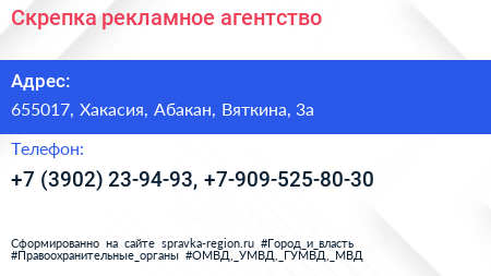 Скрепка, рекламное агентство по адресу 655017, Хакасия, Абакан, Вяткина, 3а в дальнейшем Организация, размещена в следующих категориях:
