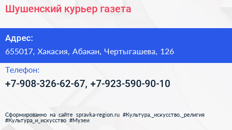 Шушенский курьер, газета по адресу 655017, Хакасия, Абакан, Чертыгашева, 126 в дальнейшем Организация, размещена в следующих категориях: