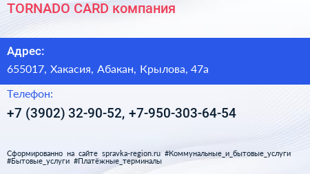 TORNADO CARD, компания по адресу 655017, Хакасия, Абакан, Крылова, 47а в дальнейшем Организация, размещена в следующих категориях: