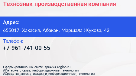 Технознак, производственная компания по адресу 655017, Хакасия, Абакан, Маршала Жукова, 42 в дальнейшем Организация, размещена в следующих категориях: