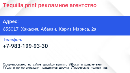 Tequilla print, рекламное агентство по адресу 655017, Хакасия, Абакан, Карла Маркса, 2а в дальнейшем Организация, размещена в следующих категориях:
