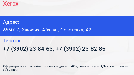 Xerox по адресу 655017, Хакасия, Абакан, Советская, 42 в дальнейшем Организация, размещена в следующих категориях: