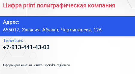 Цифра print, полиграфическая компания по адресу 655017, Хакасия, Абакан, Чертыгашева, 126 в дальнейшем Организация, размещена в следующих категориях: