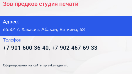 Зов предков, студия печати по адресу 655017, Хакасия, Абакан, Вяткина, 63 в дальнейшем Организация, размещена в следующих категориях: